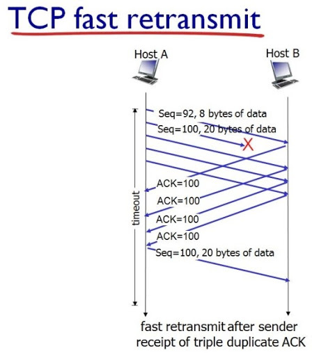 빠른 재전송은 먼저 도착해야 하는 패킷이 도착하지 않고 다음 패킷이 도착한 경우에도 수신자가 일단 ACK 패킷을 보내는 방식이다. 중간에 패킷이 하나 손실되면 송신자는 중복된 ACK 패킷을 통해 이를 감지하고 유실되었던 패킷을 재전송한다. 또한 중복된 패킷을 3개 받으면 반드시 손실된 패킷을 재전송한다.
