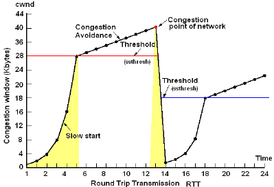 느린 시작은 전송 가능한 버퍼의 양인 혼잡 윈도우의 초깃값을 작게 설정하여 전송한다. 예를 들어 통신이 시작되면 패킷 1개만 보내고, ACK를 받으면 패킷 2배인 2개를 전송한다. 이러한 과정을 패킷 유실이 발생하기 전까지 반복하는 방식이다. ACK 응답을 받지 못하면 혼잡 윈도우의 크기는 더 이상 늘리지 않는다.