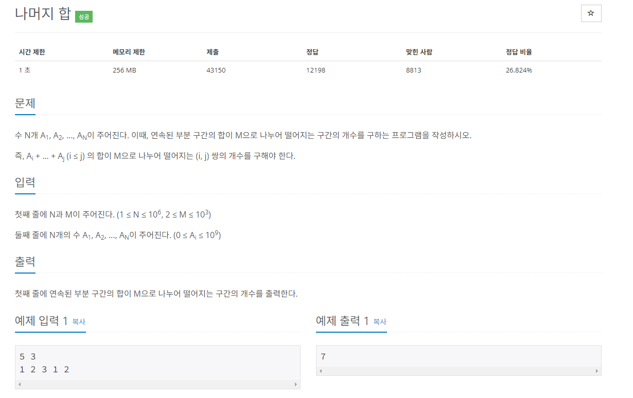 따라서 S[i] % M == S[j] % M인 i와 j를 찾으면 되므로 나머지 배열의 같은 값을 가진 인덱스 중에서 2개를 고른 뒤 정답에